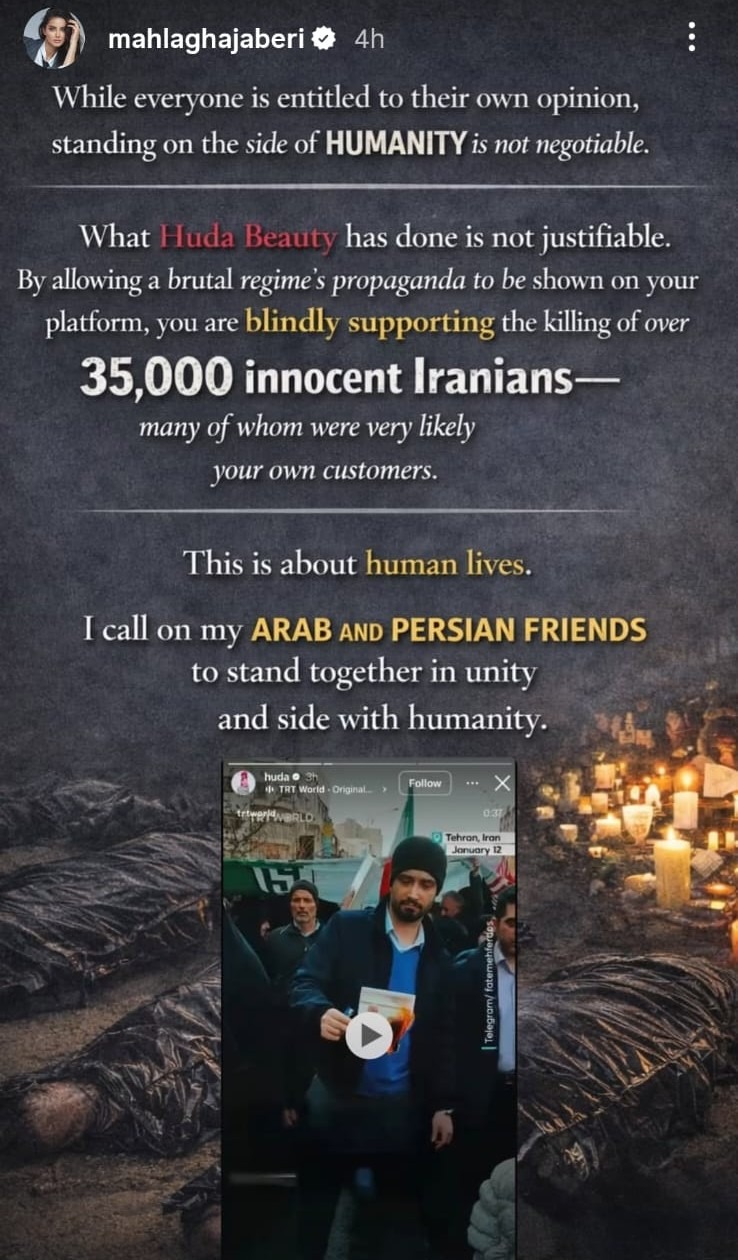 تواجه هدى قطان، مؤسسة علامة مستحضرات التجميل هدى بيوتي، موجة من الانتقادات ودعوات المقاطعة من ناشطين إيرانيين، عقب إعادة نشرها مقاطع فيديو من قناة تي آر تي وورلد على إنستجرام، حيث اعتبروا أنها تدعم النظام الإيراني.