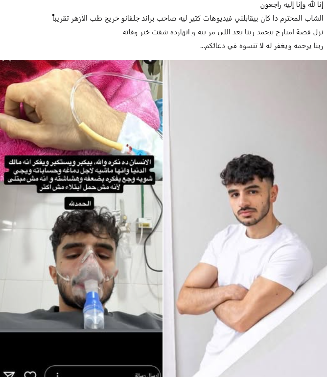 توفي الطبيب الشاب وصانع المحتوى أحمد مصطفى البراجة، دفعة 62 بكلية الطب بجامعة طنطا، بعد صراع قصير مع المرض، مما أدى إلى حالة من الحزن بين زملائه ومرتادي مواقع التواصل الاجتماعي.