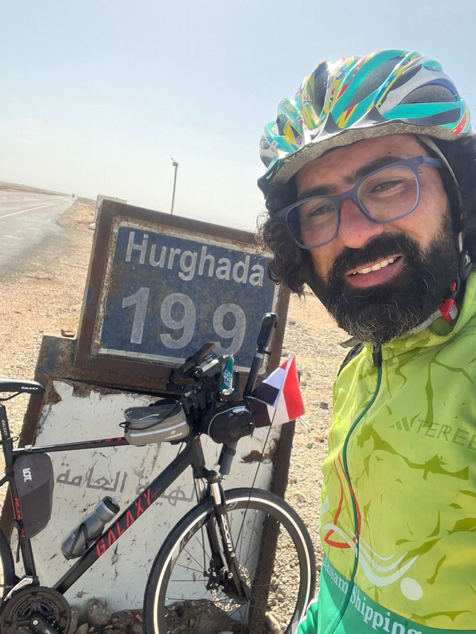 كما لا يفوت الشاب فرصة لإبراز جمال الطريق، حيث يرافقه البحر دائمًا عن يساره، بينما ترتفع الجبال من حوله، مؤكدًا أن رحلته تحمل أيضًا رسالة لدعم السياحة الداخلية وتعريف العالم بجمال الطرق المصرية وطبيعتها الآمنة.