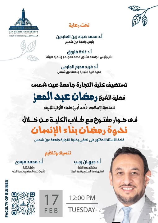 تستضيف كلية التجارة بجامعة عين شمس الشيخ رمضان عبد المعز في حوار مفتوح مع طلاب الكلية اليوم الثلاثاء 17 فبراير في تمام الساعة 12 ظهرًا تحت رعاية محمد ضياء زين العابدين رئيس الجامعة وغادة فاروق نائب رئيس الجامعة لشئون خدمة المجتمع وفريد محرم الجارحي عميد الكلية.
