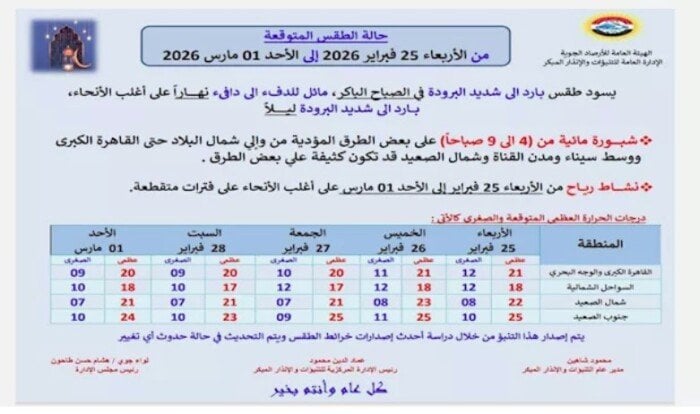 أعلنت الهيئة العامة للأرصاد الجوية عن توقعاتها لحالة الطقس من الأربعاء 25 فبراير حتى الأحد 1 مارس 2026، وذلك بناءً على أحدث بيانات الأقمار الصناعية وتقنيات الرصد الجوي المتاحة في مصر.