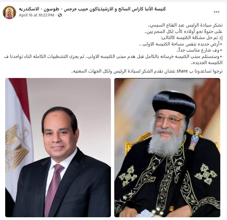 كما أعربت الكنيسة عن تقديرها للجهات المعنية، مقدمة الشكر للرئيس عبدالفتاح السيسي على اهتمامه ورعايته لأبناء الوطن وسعيه لإنهاء الأزمة.