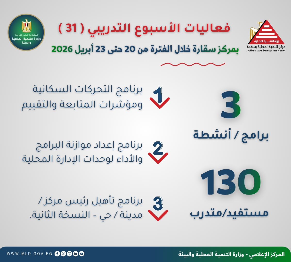 أعلنت الدكتورة منال عوض وزيرة التنمية المحلية والبيئة عن بدء فعاليات الأسبوع التدريبي الحادي والثلاثين من الخطة التدريبية 2025 / 2026 في الفترة من 20 إلى 23 أبريل 2026 بمركز التنمية المحلية للتدريب بسقارة.