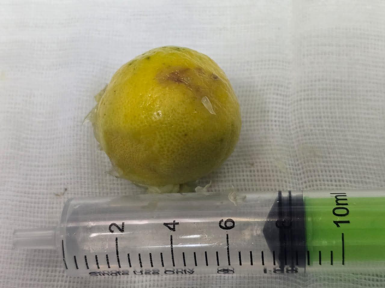 أظهرت الفحوصات الطبية أن الشاب ابتلع ليمونة كبيرة الحجم تجاوز قطرها 3 سم استقرت أعلى المريء مما أدى إلى انسداد تام وصعوبة في التعامل معها نظرًا لملمسها الأملس وخطورة تحريكها التي قد تتسبب في تهتك جدار المريء.