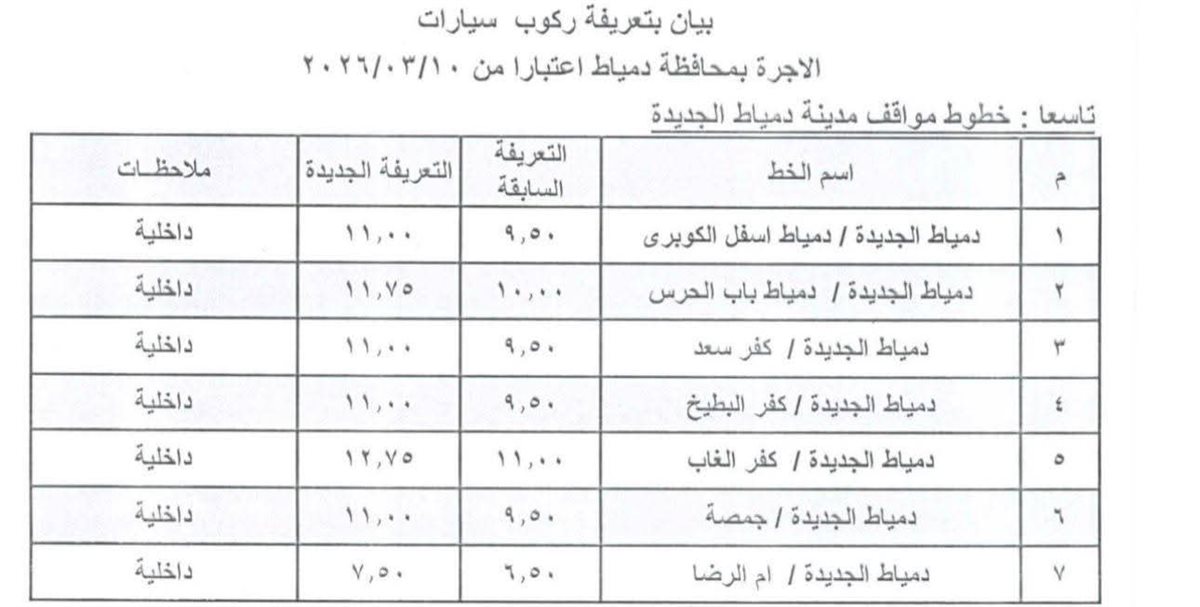 أعلن الدكتور حسام الدين فوزى محافظ دمياط عن اعتماد تعديل تعريفة الركوب لسيارات النقل الجماعي والسرفيس في المحافظة بعد زيادة أسعار المواد البترولية اعتبارًا من اليوم.
