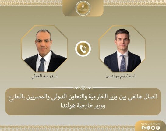 جاء ذلك خلال اتصال هاتفي مع توم بيريندسن، وزير خارجية هولندا الجديد، يوم الأربعاء 18 مارس، حيث تم بحث العلاقات الثنائية والأوضاع الراهنة في المنطقة