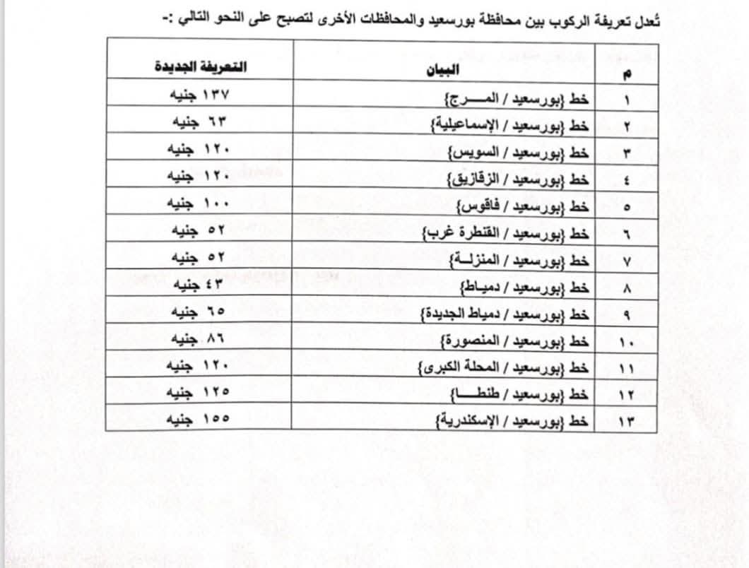 كما حددت التعريفة بين بورسعيد-القنطرة غرب 52 جنيها وبورسعيد-المنزلة 52 جنيها وبورسعيد-دمياط 43 جنيها وبورسعيد-دمياط الجديدة 65 جنيها وبورسعيد-المنصورة 86 جنيها وبورسعيد-المحلة الكبرى 120 جنيها وبورسعيد-طنطا 125 جنيها وبورسعيد-الإسكندرية 155 جنيها.