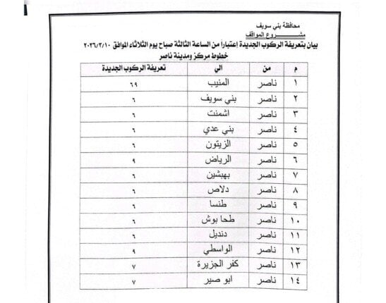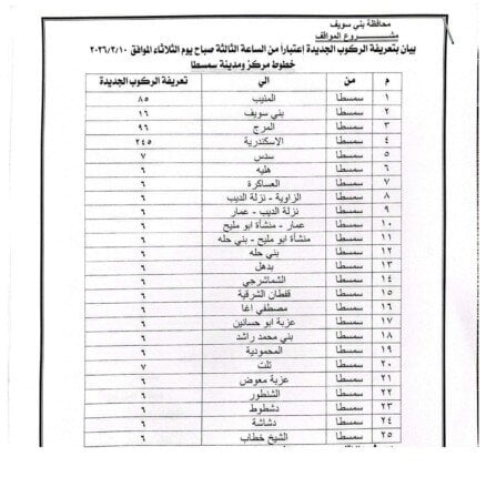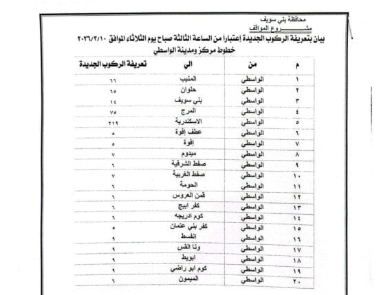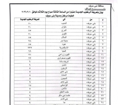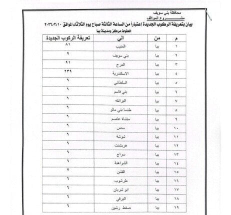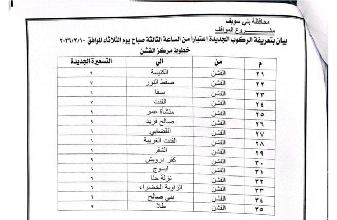 أصدر اللواء عبد الله عبد العزيز محافظ بني سويف قرارًا بتعديل تعريفة الركوب لسيارات الأجرة والنقل الداخلي والخارجي، وذلك اعتبارًا من اليوم الثلاثاء 10 مارس 2026.