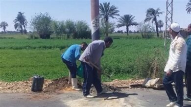 إعادة تركيب أعمدة الإنارة في قرية صفط الشرقية بالمنيا بعد الانتهاء من رصف الطريق